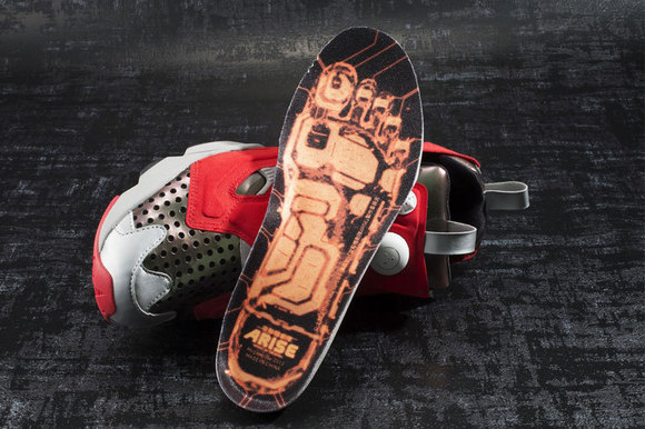 昨年より展開している劇場作品『攻殻機動隊 ARISE』を題材に、タチコマの前身となる"ロジコマ"をモチーフに、特徴的なボディを意識した赤いカラーリングをベースとしています。アッパーとヒールには光学迷彩を彷彿とさせる、見る角度によって色合いが変わる特殊素材を使用。空気を送るポンプには3つのドットをプリントし、ロジコマの球形の外部観測機器と同じ意匠をあしらい、さらに、さらに、前回も注目されていたインソール。「電脳世界とリンクする」というコンセプトにちなんで、足の裏と全身の各部位が密接に結びついていることをデジタルUI風に表現。